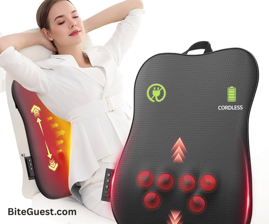 This back massager is a full-sized model that gives you the best of both worlds: deep-tissue kneading and soothing heat, so gone are the muscle pain and tightness. Besides, its cordless, rechargeable design lets you use it anywhere, making it perfect for relaxation at home or quick office breaks. It also targets the entire back, thereby enhancing blood flow and alleviating chronic pain.