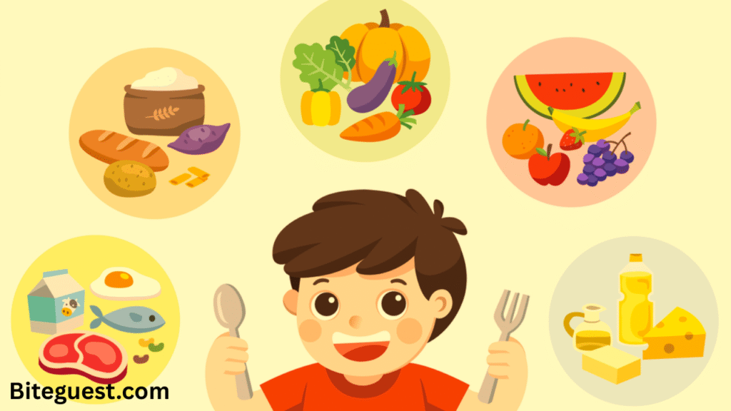 A balanced diet includes foods from all food groups. Each group plays a different role in child health.